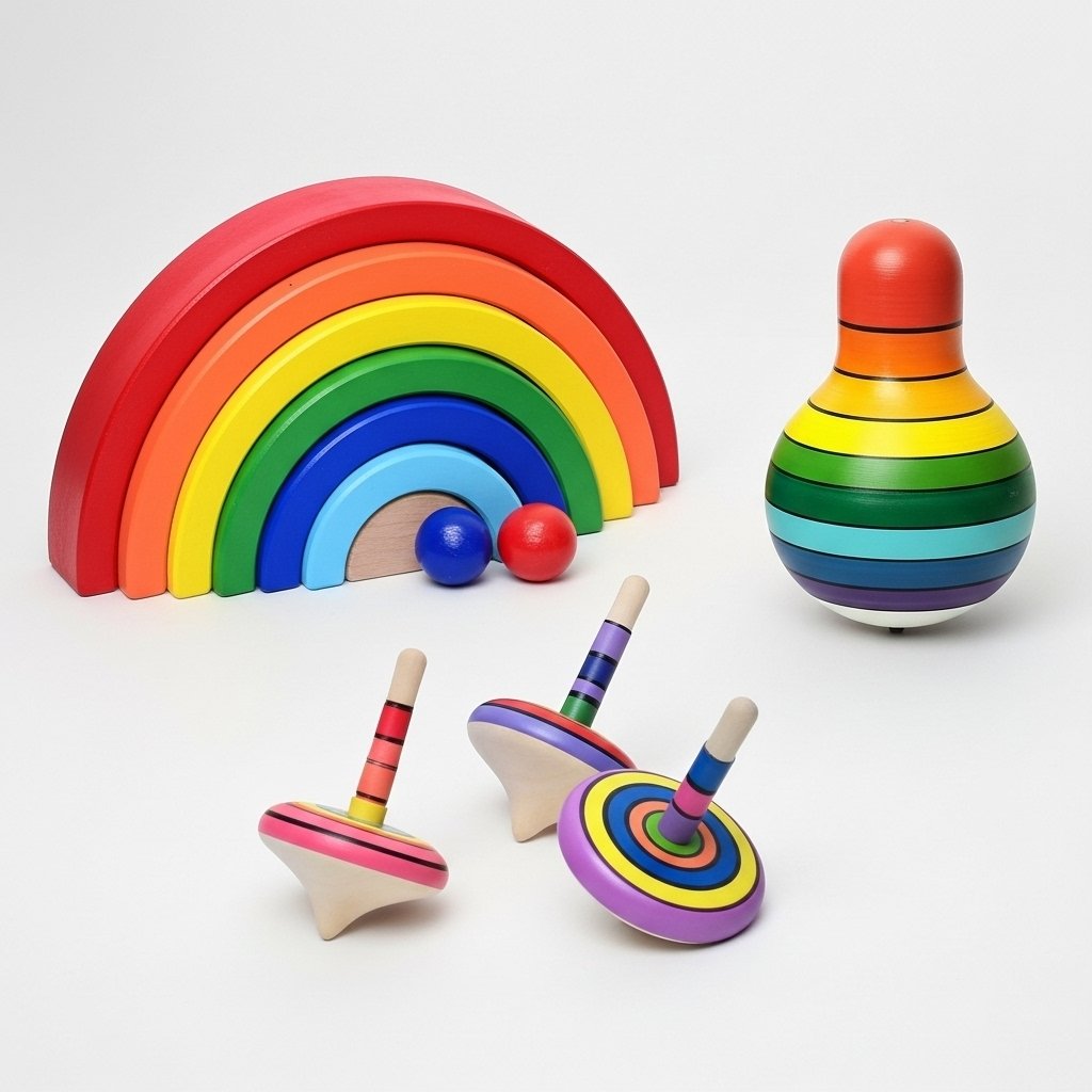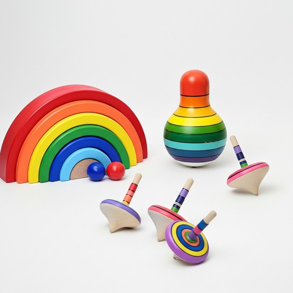 The Channapatna set of wooden toys includes spinning tops, a stacking tower, and a rainbow set. They come as a set of multiple wooden toys. The toys promote open-ended learning.
