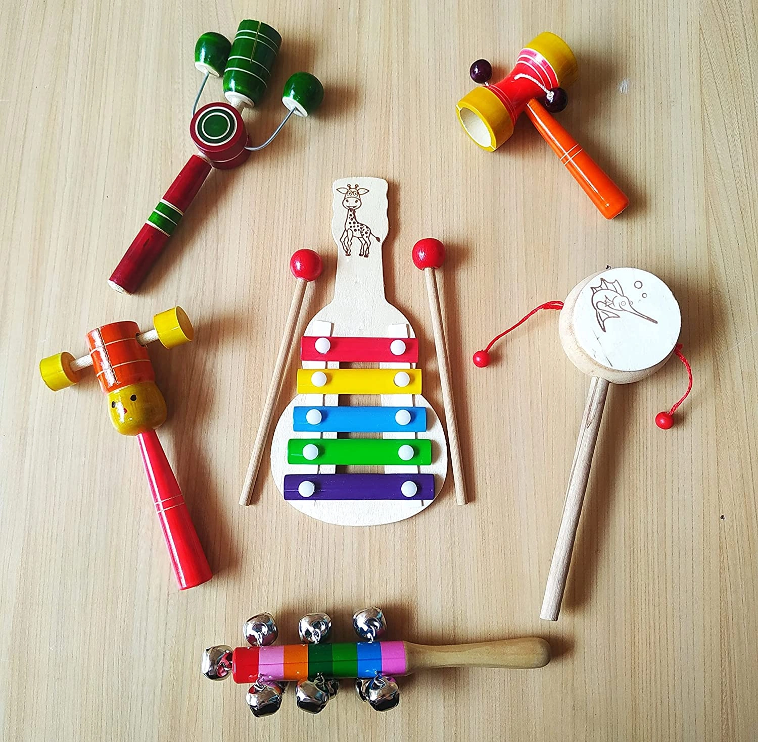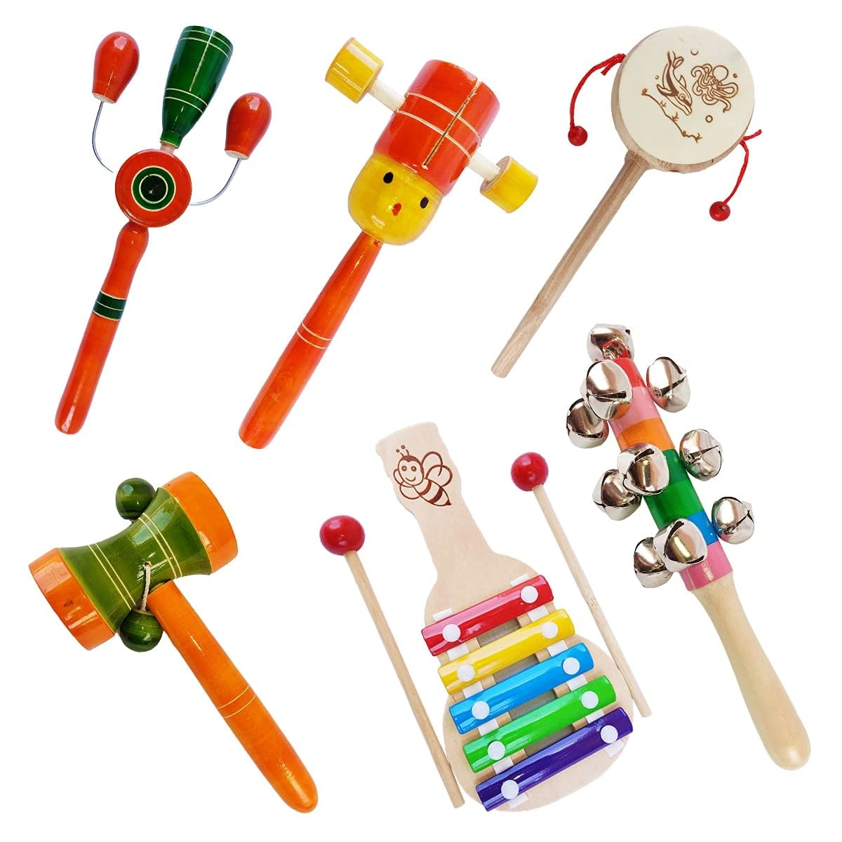 Channapatna toys make a 100% kid-friendly wooden rattle toy set. The toy set includes rattle toys in different shapes and colors. The rattling sound and vibrant colors grab kids’ attention. They love playing with these toys.