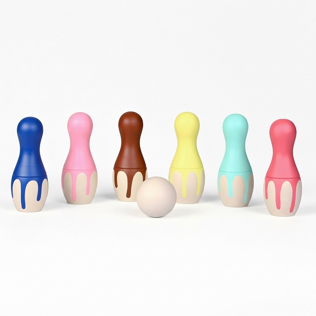 This wooden toy set includes bowling pins, a roly-poly, and spinning tops. All the toys support open-ended learning.