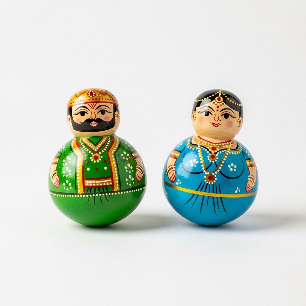 Eco-friendly wooden materials combine with non-toxic lacquer paints to form this toy that promotes toddler movement learning through its wobbling feature. The stable rounded bases provide secure play conditions and the attractive Raja–Rani printed theme enhances cultural value in both toy collections and home decor.