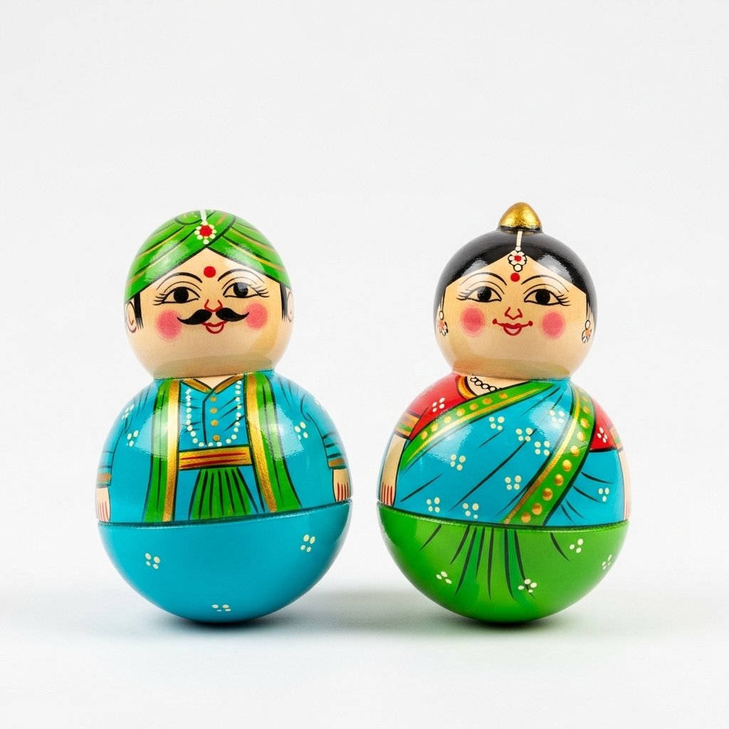 Discover the Long-lasting traditional Indian art skills through Channapatna Wooden Raja and Rani Roly-Poly Dolls – Handcrafted Set of 2 (Green & Turquoise). Hand-assembled traditional royal figures and lively curves with detailed hand-locking colors on these excellent wobble toys display the true beauty of Indian craftsmanship.