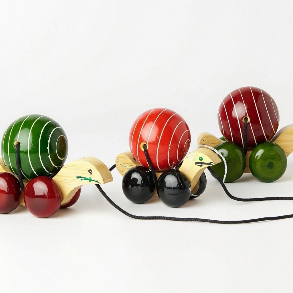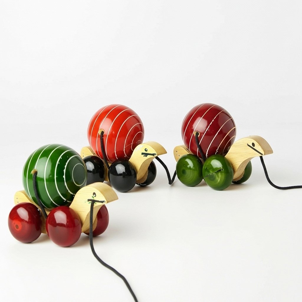 - Three handmade pull-along wooden toys consisting of snail + turtle designs