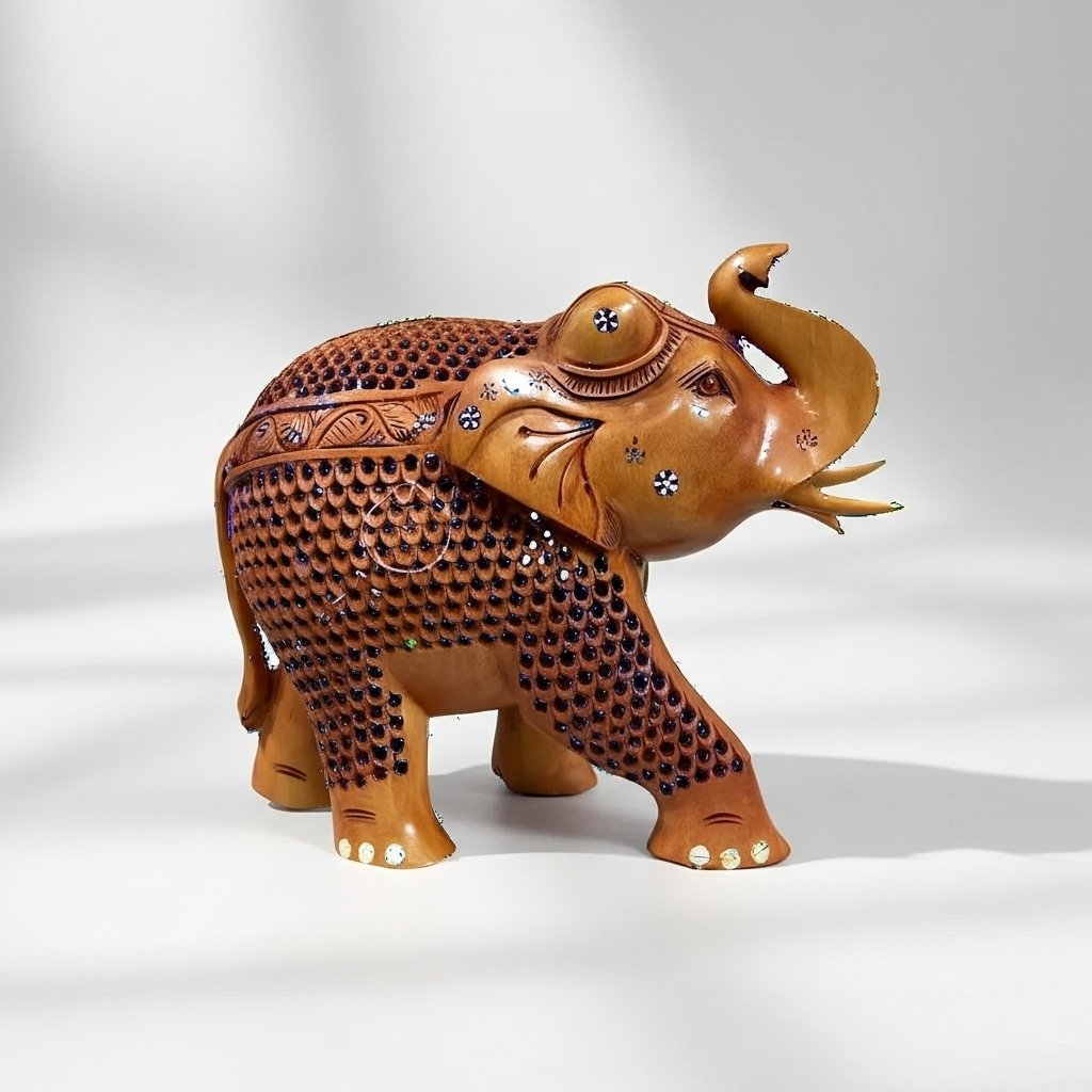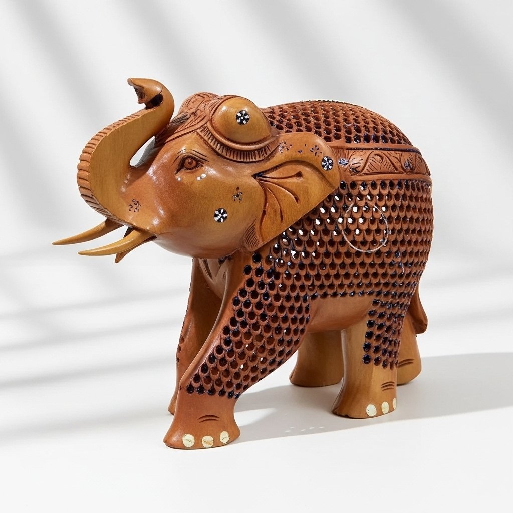 Make a lasting impression on your deòr with the grand Imperial Wooden Elephant Figurine – 8-Inch Hand-Carved Jaali Masterpiece. Made with skilled craftsmanship by expert professionals this elephant displays stunning traditional lattice work known as jaali which uses intricate carving to produce transparent patterns.