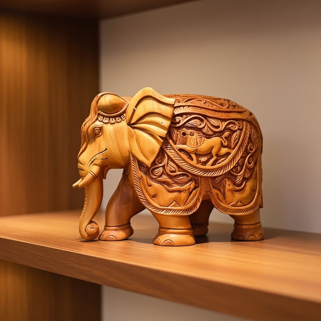 Majestic Wooden Elephant – 6-Inch Elegant Hand-Carved Artifact lets you add grandeur to your home space. This spectacular elephant figurine comes from expert artisans who produce fine details and smooth shapes along with a polished wooden finish which complements both traditional and luxury interior designs.