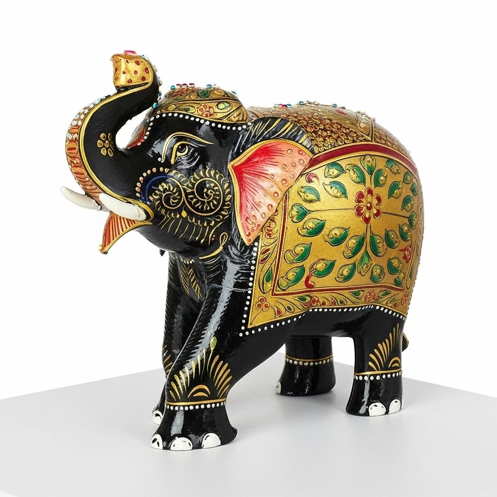 Decorate your area in upscale style with the Premium Black & Gold Royal Elephant Figurine – Handcrafted Trunk-Up Décor (6-Inch). Indian artisans hand create this beautiful elephant statue of matte-black body decorated with detailed gold design work to create contemporary and regal fusion style.