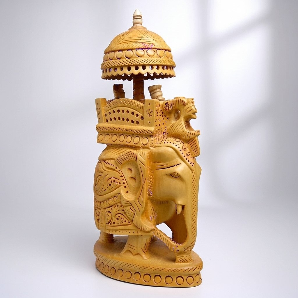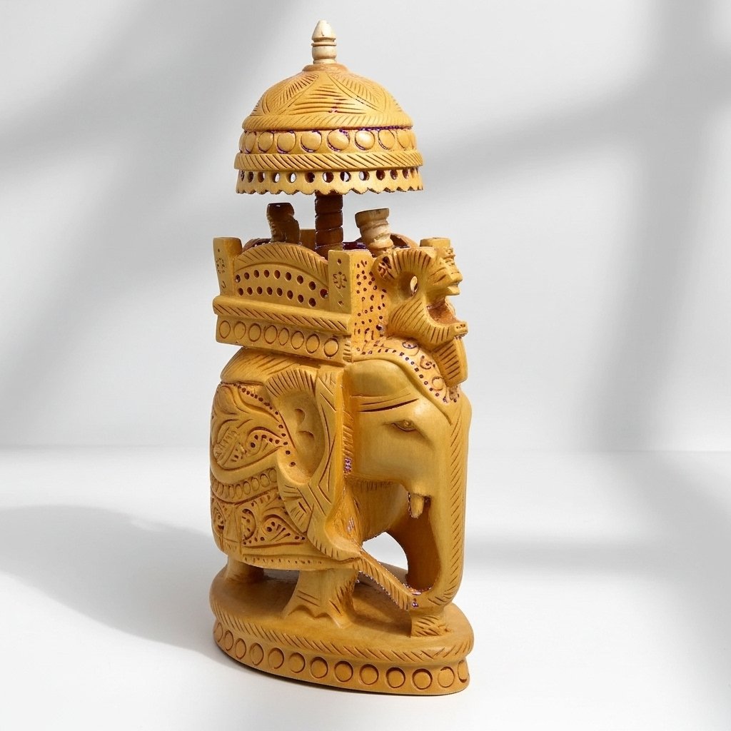 - Handmade wooden elephant decorated with ambari.