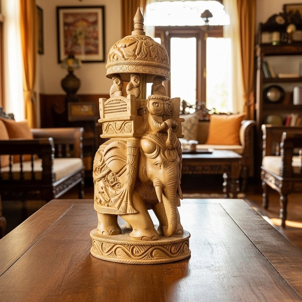 Discover Indian artistry at its finest through the Royal Wooden Shikari Ambari Elephant – 12-Inch Handcarved Masterpiece. Skilled artists created this grand sculpture which displays an intricately carved elephant transporting a traditional Shikari ambari which represents both royal lineage and ancient narrative traditions.